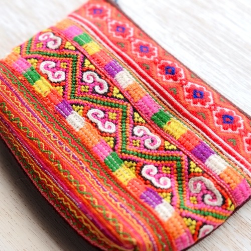 モン族のカラフルな刺繍が施された古布を使用して作られたポーチ。