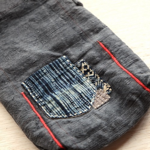 モン族の古布をベースにろうけつ染め、また民族パーツをつけて制作しました。