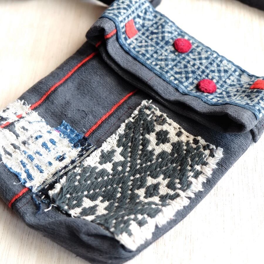 モン族の古布をベースにろうけつ染め、ターイ族の手織布を組み合わせております。