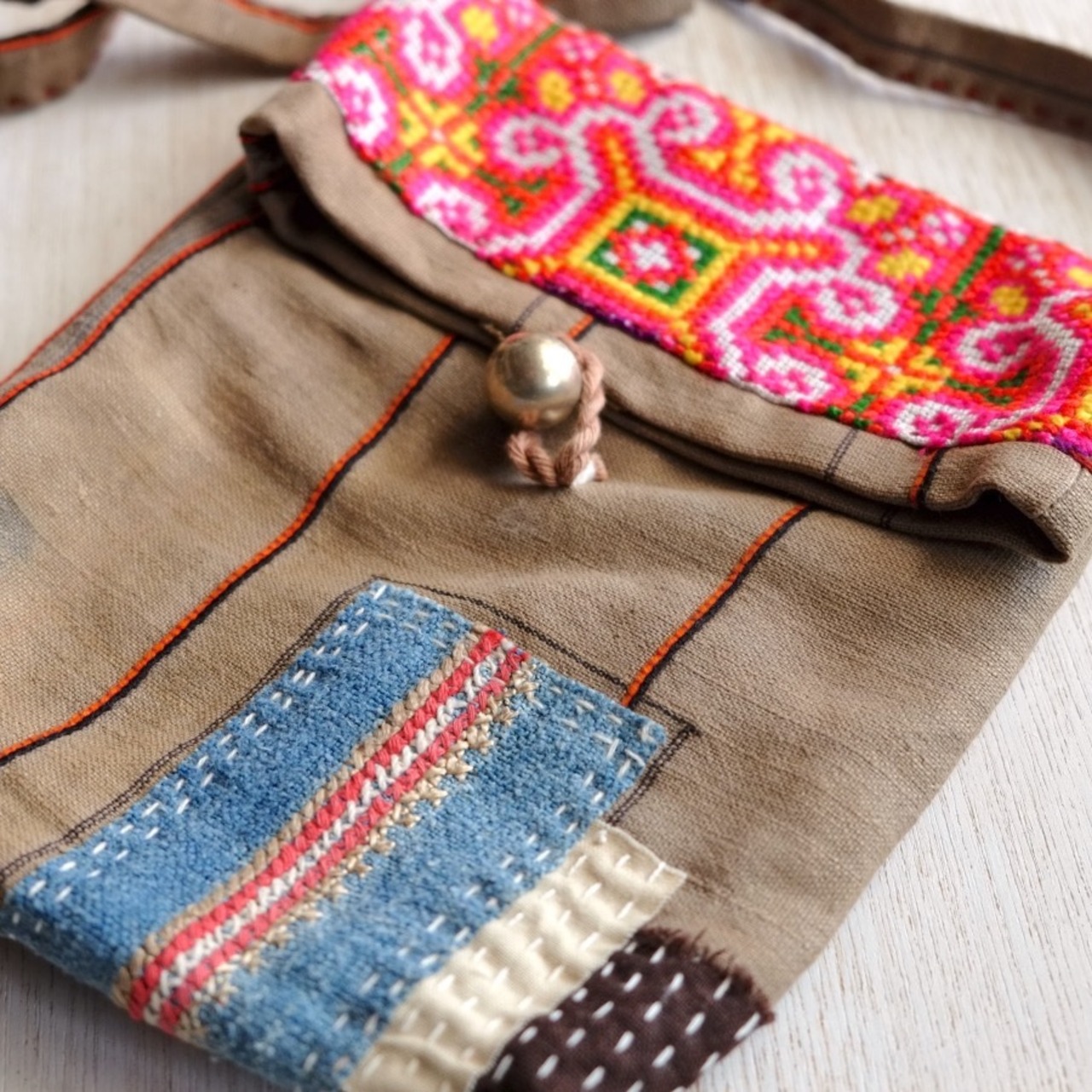 民族布に合わせて一部刺し子の当て布、また紐部分など見えるところは手縫いで仕上げてあります。