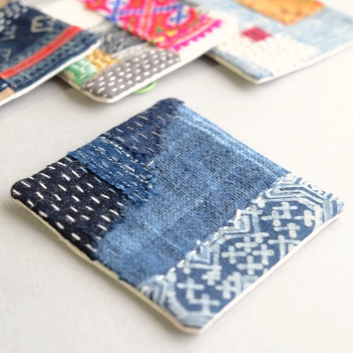 モン族の古布をベースに当て布&刺し子を組み合わせたコースター。