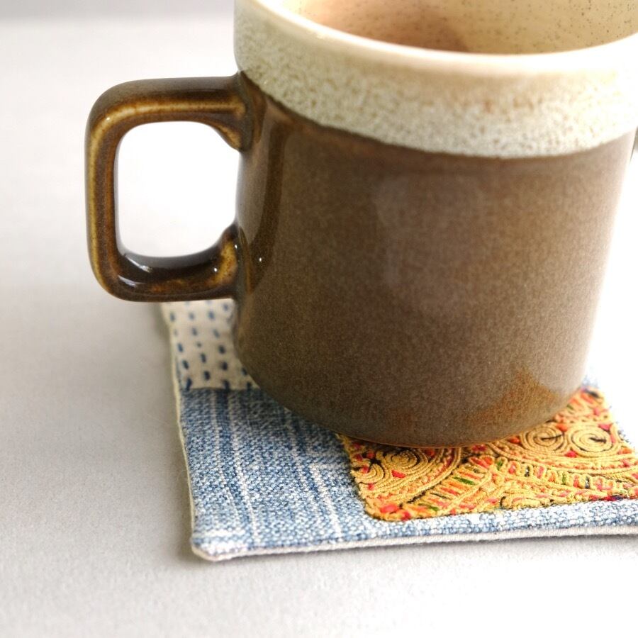 モン族の古布をベースに当て布&刺し子を組み合わせたコースター。